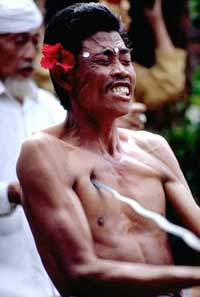 Found only in a few villages, the trance dance is scared, it used to be performed by Balinese people in earlier times to contact the spirits ancestors. Sitting in front of the temple priest, two underage girls are put into trance by the temple priest, the Pemangku. The priest, accompanied by a female choir, make offerings to the deity asking the celestial nymphs to descend from the Heaven and dance before the people through the bodies of the girls. Even though the girls have never had any dance training, they dance harmoniously with closed eyes. Then a man, accompanied by two male choirs, and ridding a hobby horse dances with closed eyes through a fire made from coconut husks. The songs of the men’s chorus lead him jumping repeatedly into the fire but surprisingly he remains unhurt.